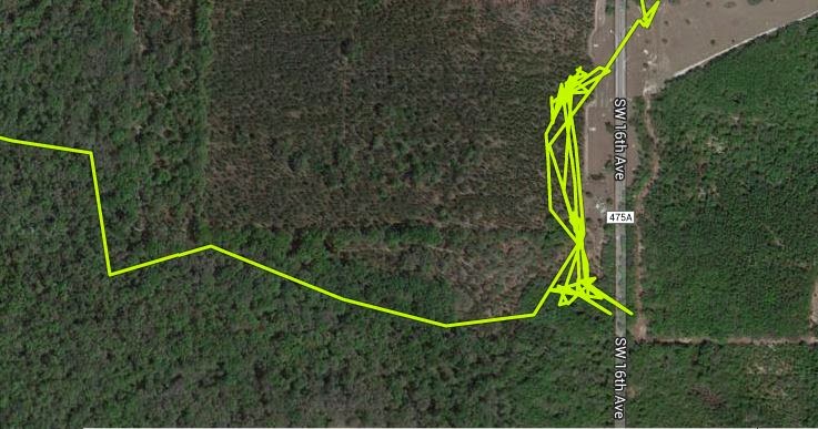 Another meal was on order at this next transition area, and by meal, I mean cans of Chunk soup, scoops of peanut butter, ravioli, MREs, and dry-packed food. Upon leaving, we headed out to find CP25, which was supposed to be on very wet trails. At the entrance to the red trails, the team spent some time arguing about whether we could go pass a private property gate. I looked down and saw hundreds of foot tracks that entered the gate. Bill and Robert opposed, so we walked up the road some more. Half-way up the road and after another discussion of "how do we even get to CP25 without being on the supposedly forbidden red trails", I urged the team to bushwhack straight east from where we were to hit those red trails.